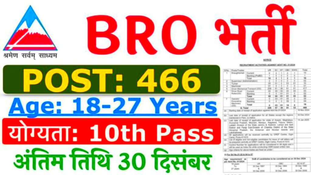 सीमा सड़क संगठन भर्ती का नोटिफिकेशन हुआ जारी जानकारी आप लोगों को जानना है तो इस आर्टिकल को ध्यान से पढ़े और दिखाइए की कौन-कौन आवेदन कर सकता है सीमा सड़क संगठन में दसवीं पास 466 पदों पर भारती का नोटिफिकेशन जारी कर दिया गया है और सभी राज्यों के पास अभ्यर्थी ऑफलाइन मॉड से आवेदन कर सकते हैं
