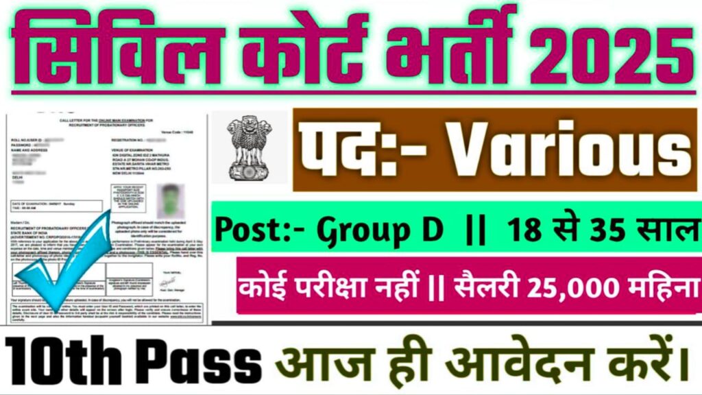 नमस्कार दोस्तों, अगर आप सरकारी नौकरी की तलाश में हैं, तो आपके लिए एक बेहतरीन मौका आया है। सिविल कोर्ट की ओर से विभिन्न पदों पर भर्ती निकाली गई है, जिसमें ऑफिस असिस्टेंट/क्लर्क, डाटा एंट्री ऑपरेटर (DEO) और ऑफिस प्यून जैसे पद शामिल हैं।