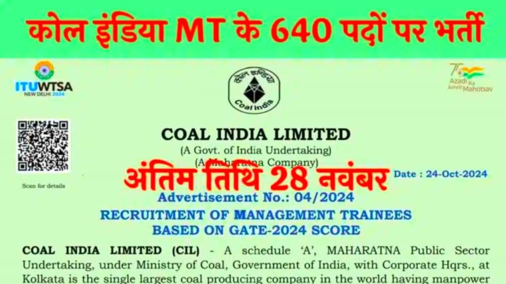 नमस्कार दोस्तों अगर आप भी कॉल इंडिया मैनेजमेंट भर्ती में फॉर्म अप्लाई करना चाहते हैं तो आपके लिए बहुत बड़ी खुशखबरी आ चुकी है कॉल इंडिया मैनेजमेंट भारती की तरफ से जिसमें 28 नवंबर तक फॉर्म भरे जाएंगे और 640 पदों पर भारती का नोटिफिकेशन जारी कर दिया गया है तो आप लोग इस भर्ती में जल्द से जल्द फॉर्म भर सकते हैं