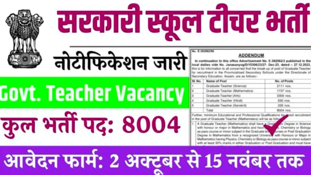 नमस्कार दोस्तों अगर आप भी सरकारी स्कूल टीचर भर्ती में फॉर्म अप्लाई करना चाहते हैं तो आपके लिए बहुत बड़ी खुशखबरी आ चुकी है सरकारी स्कूल टीचर भर्ती की तरफ से जिसमें 15 नवंबर तक फॉर्म भरे जाएंगे और 8004 पदों पर नोटिफिकेशन जारी कर दिया गया है तो आप लोग इस भर्ती में जल्द से जल्द फॉर्म भर सकते हैं