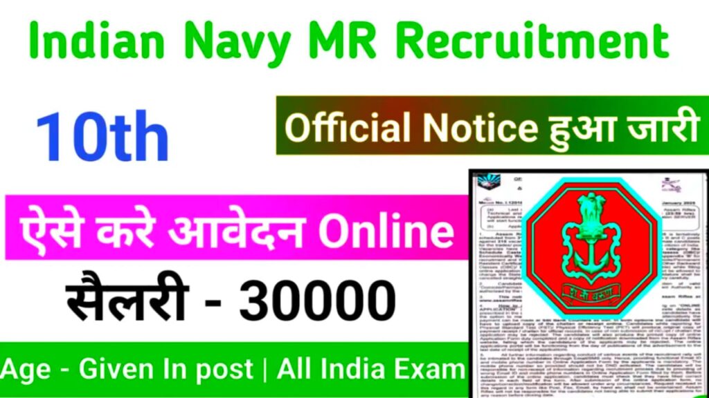 अगर आप लोग इंडियन नेवी एमआर के पदों पर आवेदन करना चाहे तो तो आप मैं आपको बता देता हूं शैक्षिक योग्यता की बात करें तो इसमे आपने किसी भी बोर्ड से दसवीं पास कर रखा है तो आप लोग आसानी से इस भर्ती में आवेदन कर सकते हैं