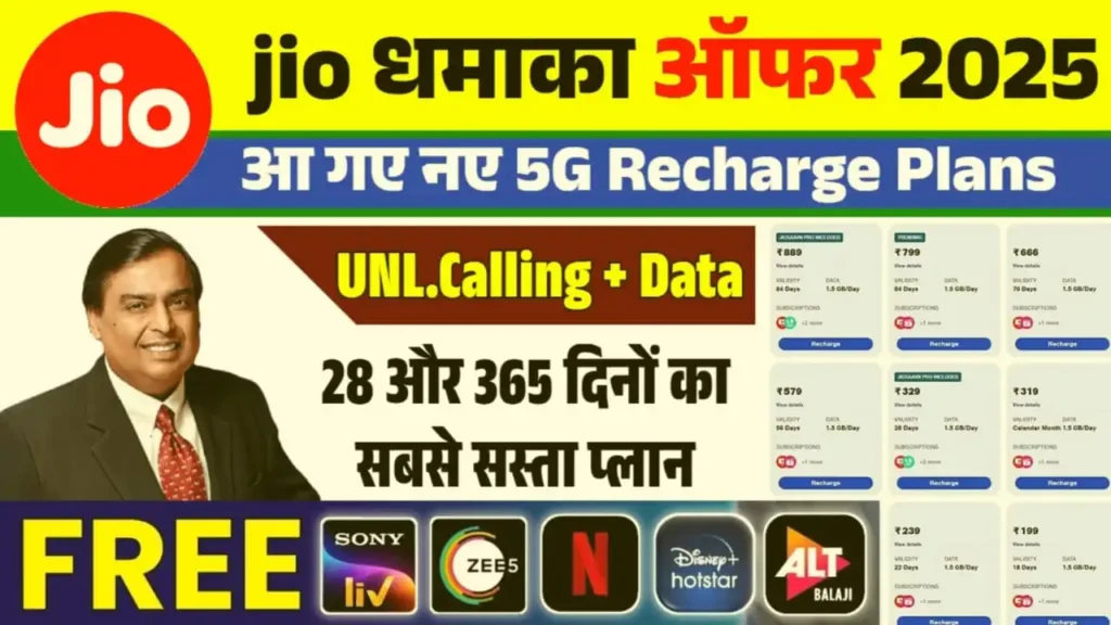 Jio Saste Recharge Plan 2025:- अगर आप भी हर महीने अपने मोबाइल का महंगा रिचार्ज करवाकर परेशान हो चुके हैं और अब ढूंढ रहे हैं कोई सस्ता लेकिन फायदेमंद Jio Recharge Plan, तो आपके लिए बहुत बड़ी खुशखबरी है। क्योंकि Jio ने हाल ही में कुछ ऐसे नए सस्ते रिचार्ज प्लान लॉन्च किए हैं, जिनमें कम कीमत में आपको भरपूर इंटरनेट, अनलिमिटेड कॉलिंग, फ्री SMS और अनलिमिटेड 5G डेटा जैसी शानदार सुविधाएं मिलेंगी।