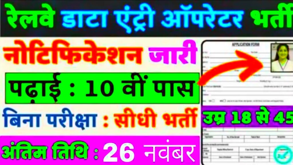 नमस्कार दोस्तों अगर आप भी रेलवे डाटा एंट्री ऑपरेटर भर्ती में फॉर्म अप्लाई करना चाहते हैं तो आपके लिए बहुत बड़ी खुशखबरी आ चुकी है रेलवे डाटा एंट्री ऑपरेटर भर्ती की तरफ से जिसमें दसवीं पास भारती का नोटिफिकेशन जारी कर दिया गया है और 26 नवंबर तक फॉर्म भरे जाएंगे तो आप लोग इस भर्ती में जल्द से जल्द फॉर्म भर सकते हैं