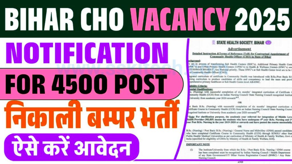 बिहार राज्य स्वास्थ्य समिति (SHSB) ने कम्युनिटी हेल्थ ऑफिसर (CHO) के कुल 4,500 पदों पर भर्ती का ऐलान किया है। यह भर्ती राष्ट्रीय स्वास्थ्य मिशन (NHM) के तहत की जाएगी, जो स्वास्थ्य सेवाओं को ग्रामीण और अर्ध-शहरी क्षेत्रों तक पहुँचाने में महत्वपूर्ण भूमिका निभाता है।